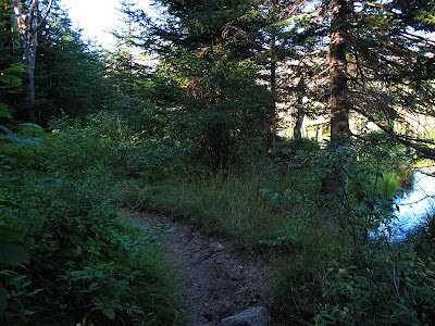 In July 1959 I hiked the whole length of Ethan Pond Trail for the first time. I was 16 and came up from Crawford Notch with my mother. We were heading for Zealand Hut for the night. It was a day just like this (Saturday 8-24-13): sunny, warm, and exceptionally clear. I remember two things distinctly: one was coming up over the height of land near Ethan Pond (sometimes called Willey Pond) and being "hit" with the rich, enticing smell of sun baked balsam fir needles. The still, warm air was filled with the evocative smell and it was wonderful. The other memory is coming around a corner and seeing for the first time the cliffs on Whitewall and the section of the old logging railroad bed, now the Ethan Pond Trail, that's cut into Whitewall's west flank several hundred feet above the river and just below the cliff face. There were no trees growing on the trail then. It was wide open all the way across the base of the cliff with just a few boulders lying on the roadbed. I remember feeling particularly small setting out across the vast open flank, the gleaming white wall of the mountain. It was dazzlingly bright in the July sun. It is quite different today. Trees, balsam fir and white birch, grow along almost its entire length and there's an accumulation of rocks of all sizes that in the intervening 50 years have, one by one, somersaulted down from the cliff and come to rest on the old railroad bed.